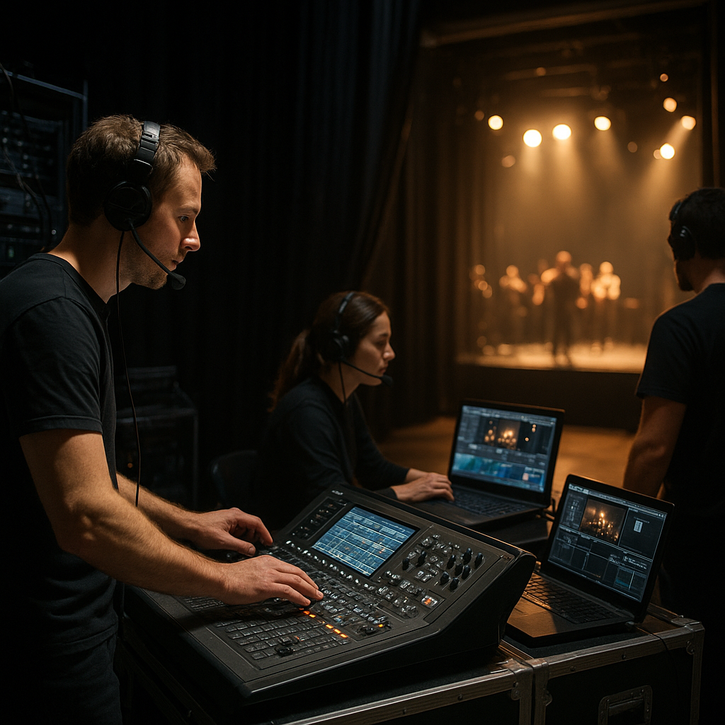 Gdy kurtyna się otwiera, w zupełnie innej strefie panuje absolutne skupienie. Kierownik produkcji wydaje komendy radiowo, a każdy technik słucha radia na oddzielnej częstotliwości. Wszędzie widać napięcie i adrenalina. Najdrobniejsze opóźnienie w obsłudze reflektora czy miksera może wpłynąć na przebieg całego pokazu.